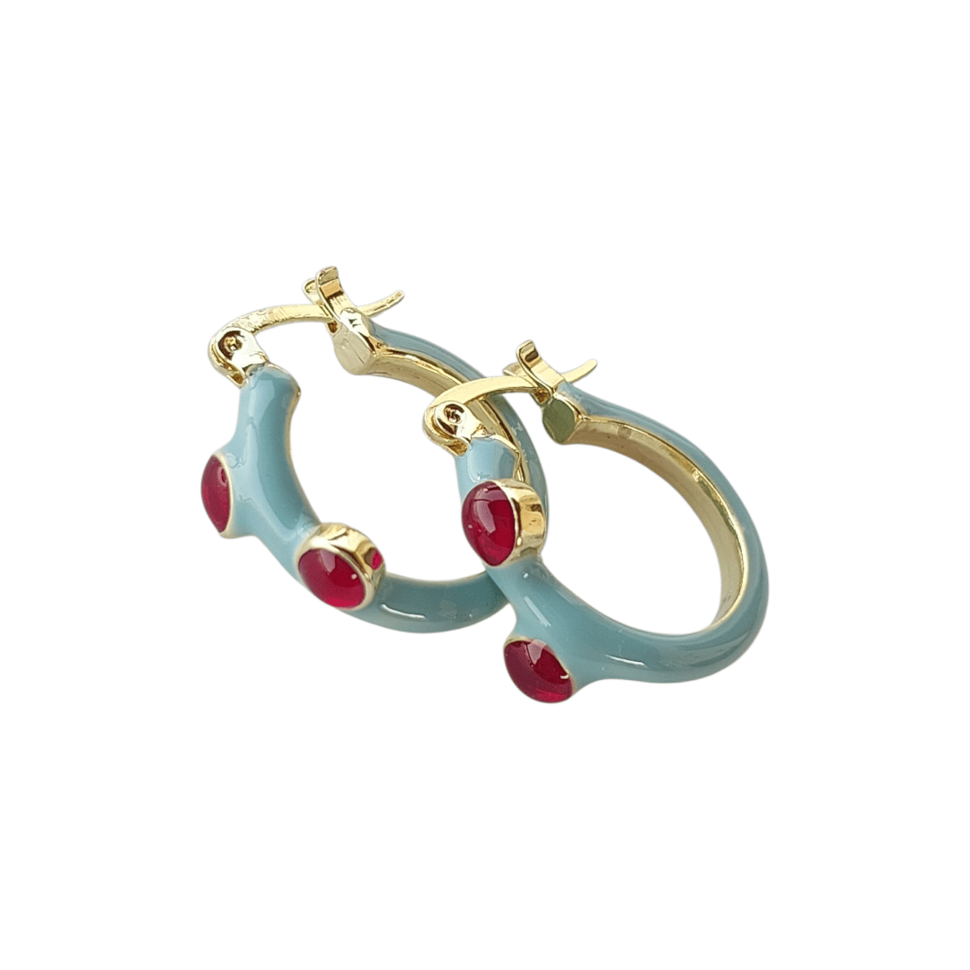 Yazın Ruhu Küpe, mavi mine ve kırmızı granat taş detaylarıyla dikkat çeken modern bir halka küpe...